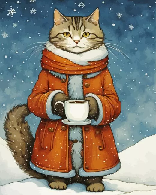 Cat In Snow Drinking Coffee Diamond Painting