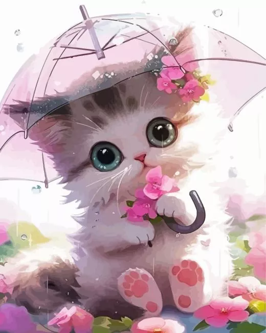 Cute Kitten Under Umbrella Diamond Painting